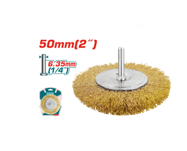 Kjo është një furçë disku me bosht (wire wheel brush with shank) nga TOTAL, me diametër 50 mm (2 inç) — një model shumë kompakt dhe i përshtatshëm për punë precize ose zona të vogla.