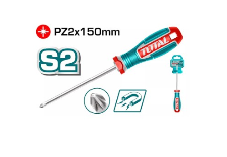 është një kaçavidë TOTAL Pozidriv (PZ2 × 150mm), e ndërtuar nga çelik S2 me majë magnetike dhe dorezë ergonomike.