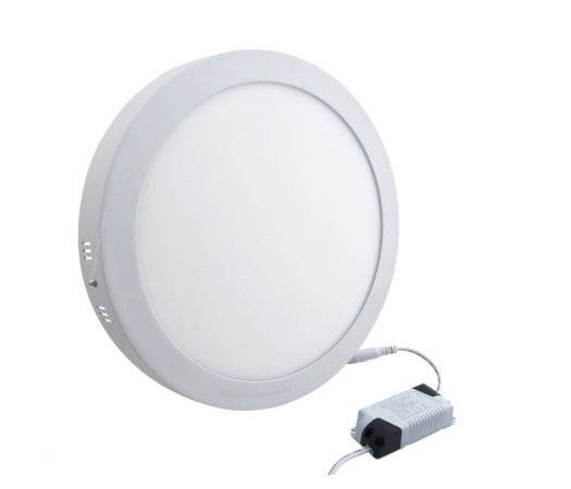 LED panel i rrumbullakët 18W, me montim sipërfaqësor (jo i futur brenda tavanit), që ofron dritë të butë dhe të shpërndarë në mënyrë uniforme.