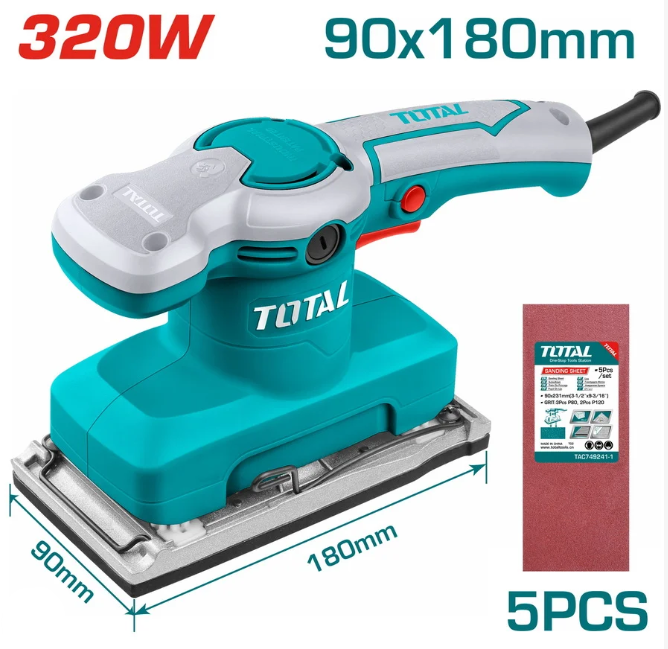 Kjo është TOTAL Sheet Sander 320W (TF2231806) – një makinë elektrike për lëmim (rërim) me sipërfaqe të madhe, e përshtatshme për përfundime të sakta, përgatitje për lyerje dhe përpunim profesional druri apo metali.