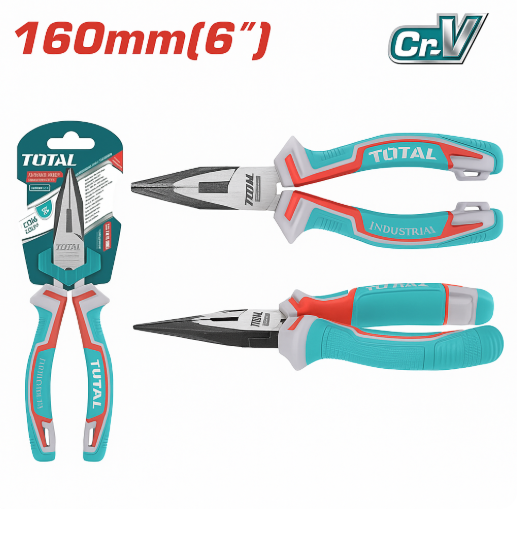 Kjo është pinca TOTAL Tools Long Nose, model THT210806, një mjet profesional i përshtatshëm për kapje, përkulje dhe prerje precize të telave dhe pjesëve të vogla metalike.