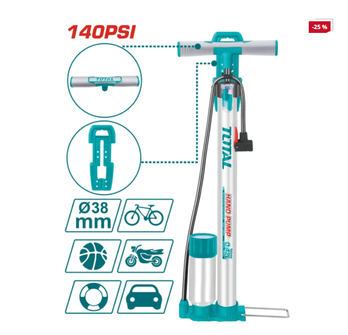 Kjo është një pompë ajri dore (hand pump / floor pump) nga marka TOTAL, e ndërtuar për fryrjen e gomave të biçikletave, motoçikletave, makinave dhe topave sportivë. Është një model praktik me performancë të mirë për përdorim shtëpiak dhe profesional.
