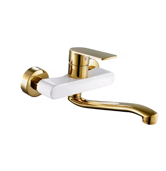 Qeshmja që shihet në foto është e tipit muror (wall-mounted) me levë të vetme (single handle) për kontroll të ujit të ngrohtë dhe të ftohtë. Gryka e saj e lakuar lejon rrjedhje të butë dhe të kontrolluar, ideale për përdorim në lavamanë të kuzhinës apo banjove moderne. Kombinimi i arit me të bardhën i jep asaj një pamje luksoze dhe elegante, duke u bërë element dizajni më vete në çdo ambient.