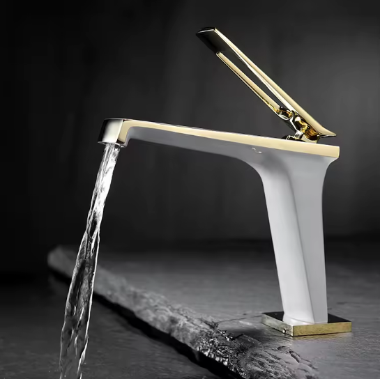 Ky është një dhe eleg rubinet lavamani luksoz me dizajn modern që kombinon ngjyrën e bardhë me elemente ari metalik – një përzierje që i jep çdo banjoje pamje premium dhe shumë të sofistikuar.