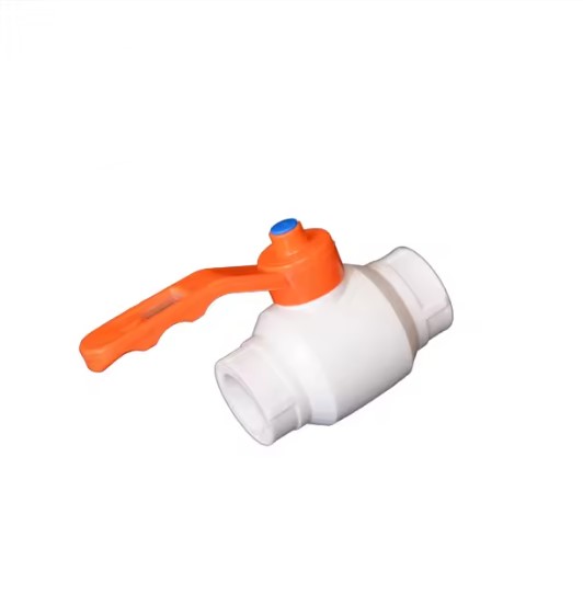 Ky që shfaqet në foto është një rubinet topthash (ball valve) PVC me dorezë portokalli, shumë i përdorur në sistemet e ujitjes dhe tubacioneve plastike.