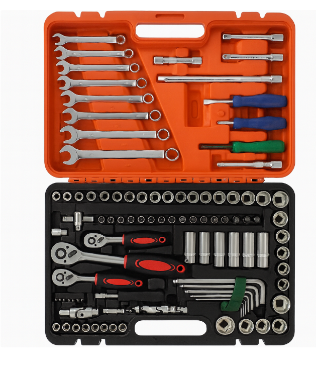 Ky është një set komplet veglash mekanike (tool kit me soketa, rraketa dhe çelësa), i përshtatshëm për punë në makinë dhe servis.