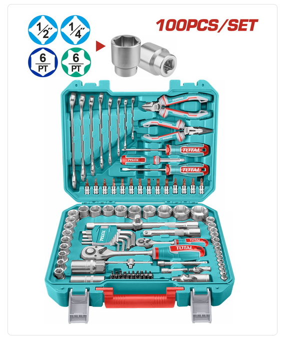 TOTAL 100PCS SOCKET & TOOL SET (Cr-V, 1/2” + 1/4”, 72T)