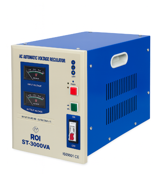 ROI ST-3000VA është një stabilizator tensioni që mban rrymën në 220V të qëndrueshme, edhe kur voltazhi bie ose rritet shumë. Kjo mbron pajisjet elektrike nga dëmtimet.
