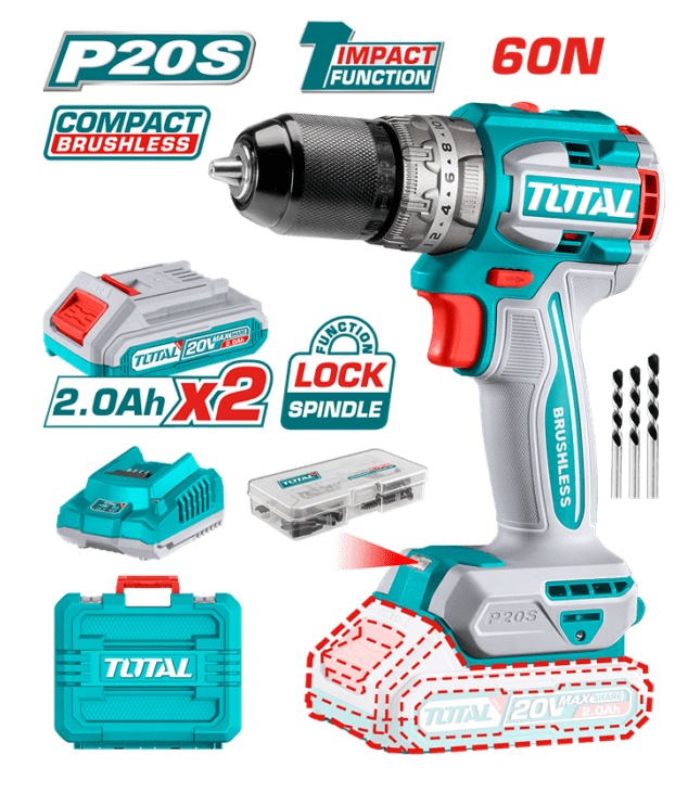 Kjo është një stërvitëse/vidhosëse goditëse pa kabllo (Cordless Impact Drill Driver) nga TOTAL Tools, pjesë e sistemit P20S 20V Max, me motor brushless (pa furça) dhe funksion goditës (Impact Function).
