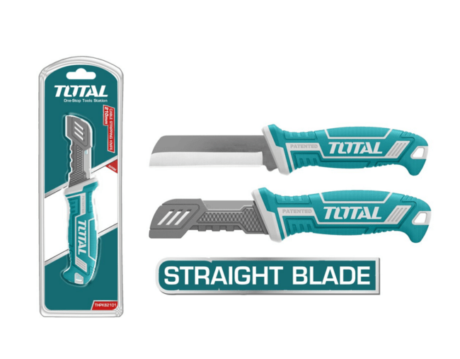 Kjo është një thikë profesionale me teh të drejtë (Straight Blade Knife) nga TOTAL Tools, e krijuar për përdorim të fortë në punë industriale, ndërtimore dhe riparuese.