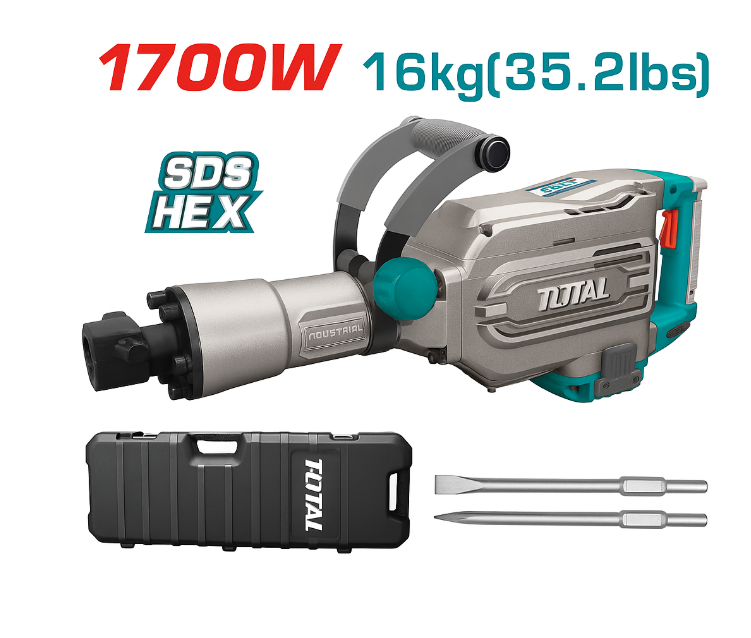 TOTAL 1700W – Çekiç elektrik industrial 16kg me fuqi 50J dhe sistem SDS-HEX për prishje betoni dhe gurësh
