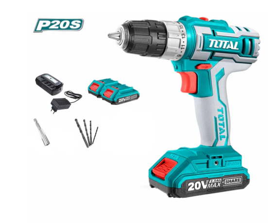 Kjo është një stërvitëse/vidhosëse pa kabllo (Cordless Drill Driver) nga TOTAL Tools, pjesë e sistemit P20S (20V Max Lithium-Ion). Ky model vjen si set i plotë, që përfshin bateri, karikues dhe disa aksesorë (stërvitëse dhe bit vidhosjeje).