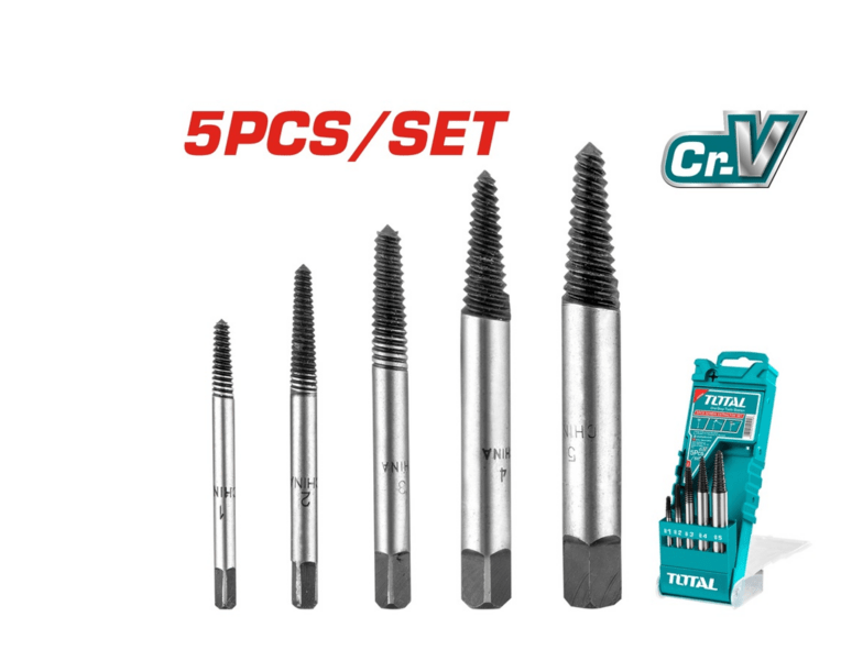 Kjo në foto është një set ekstraktorësh vidhash TOTAL (5 copë) – mjet profesional i krijuar për heqjen e vidhave ose bulonave të thyer, të dëmtuar ose të bllokuar.