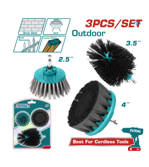 Seti profesional TOTAL për pastrim të jashtëm është i dizajnuar për punë të rënda: heqje boje, ndryshku, pastrimin e mureve me tulla, grilave metalike dhe sipërfaqeve të forta. Ideal për përdorim me stërvitje elektrike ose me bateri.